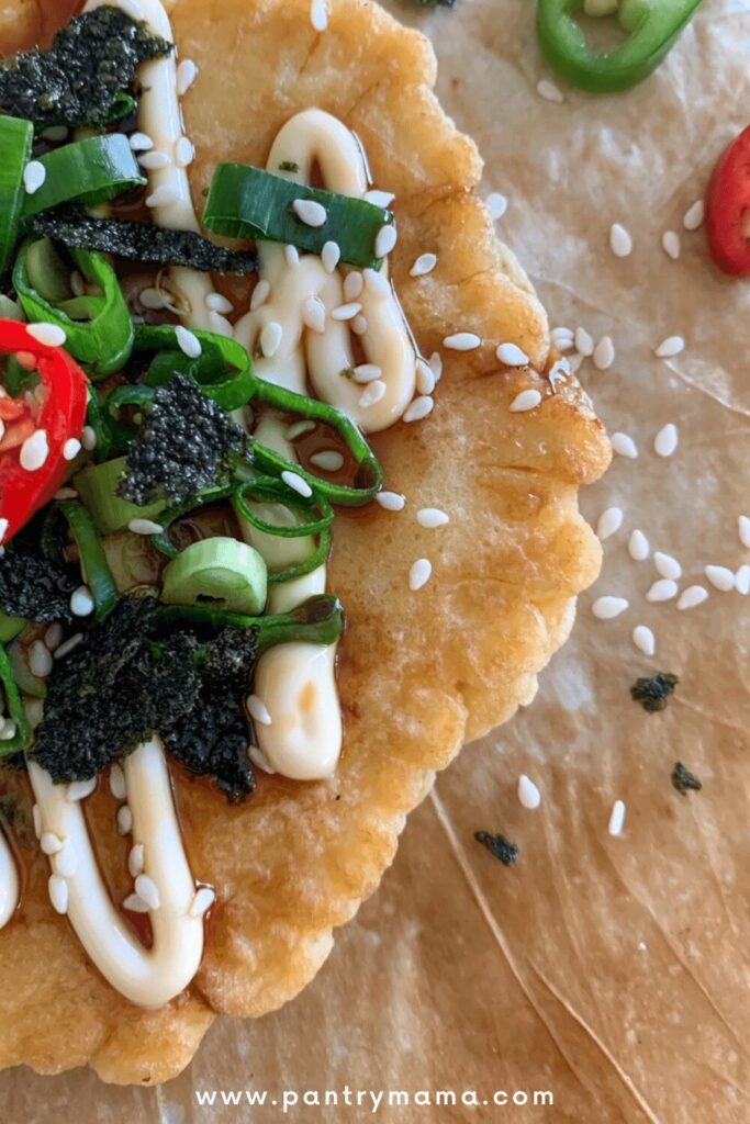 My favorite way to eat these is to cut them into wedges, top with Kewpi Mayo, sesame seeds, nori sprinkles and chili and then dip them into a bowl of Yakatori sauce (with a little chilli jam added). Seriously cannot get enough!