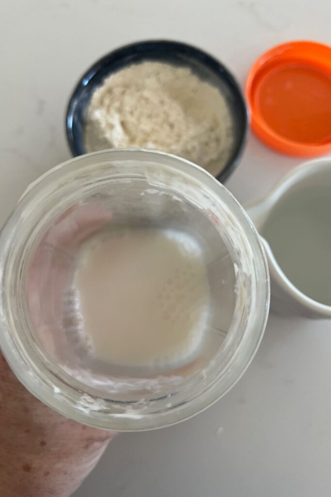 Adding water first really helps to reduce the mess in your sourdough starter jar. In fact, if you add the water and then pop the lid on and give it a shake before adding the flour, the water will clean the sides of the jar and get all the stray bits of starter off.