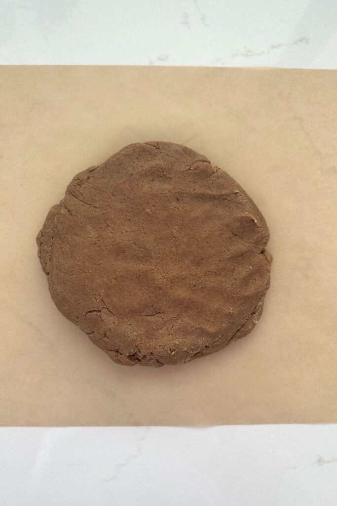 Remove the sourdough biscoff cookie dough from the bowl and place onto a piece of parchment paper. Push the dough into a disk, wrap it up and place it in the fridge to ferment for at least 2 hours (but up to 48 hours).