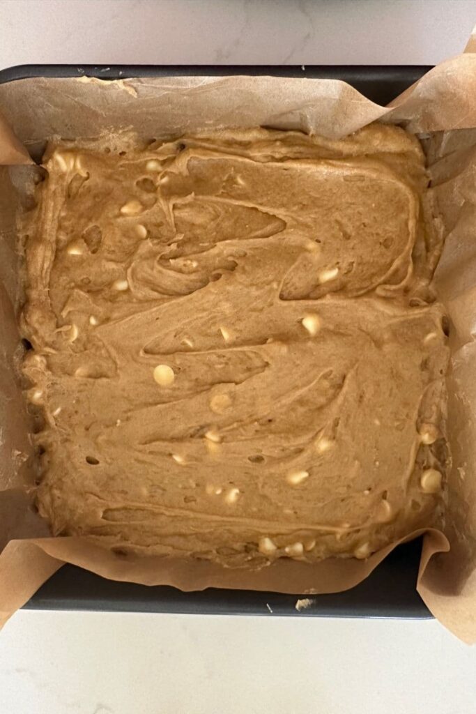 Pour the sourdough blondie batter into the prepared pan and place into the oven. It's quite a thick mixture so you'll need to spread it out evenly.