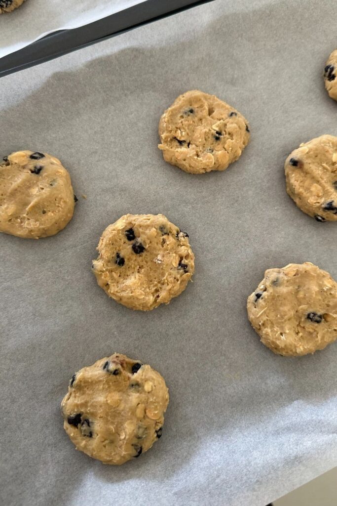 Scoop out portions of dough that weigh around 40g (I made 16 cookie dough balls weighing 40g each). Put each ball of dough onto the cookie sheet and push down a little with your fingers to flatten.