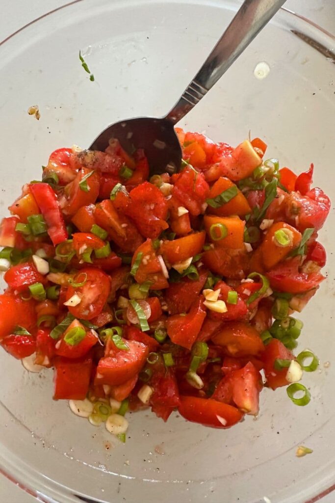 I love serving this dish alongside some homemade ricotta or burrata. Spreading the crispy sourdough toast with cream cheese before placing the bruschetta mixture on top is also a nice way to change things up.