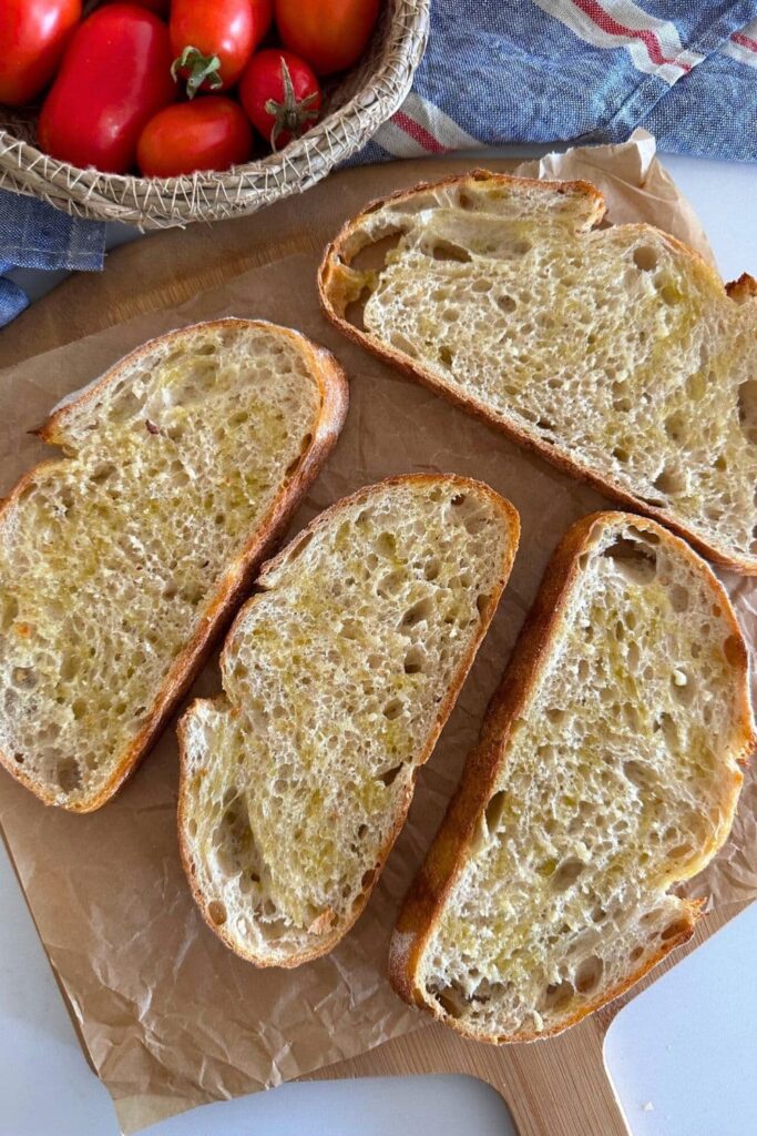 Take the slices of sourdough bread and place onto a baking tray lined with parchment paper. Drizzle each slice with olive oil and place into a 200C (390F) until just lightly toasted and crispy. Golden brown, crispy sourdough is what makes this Italian dish extra special.