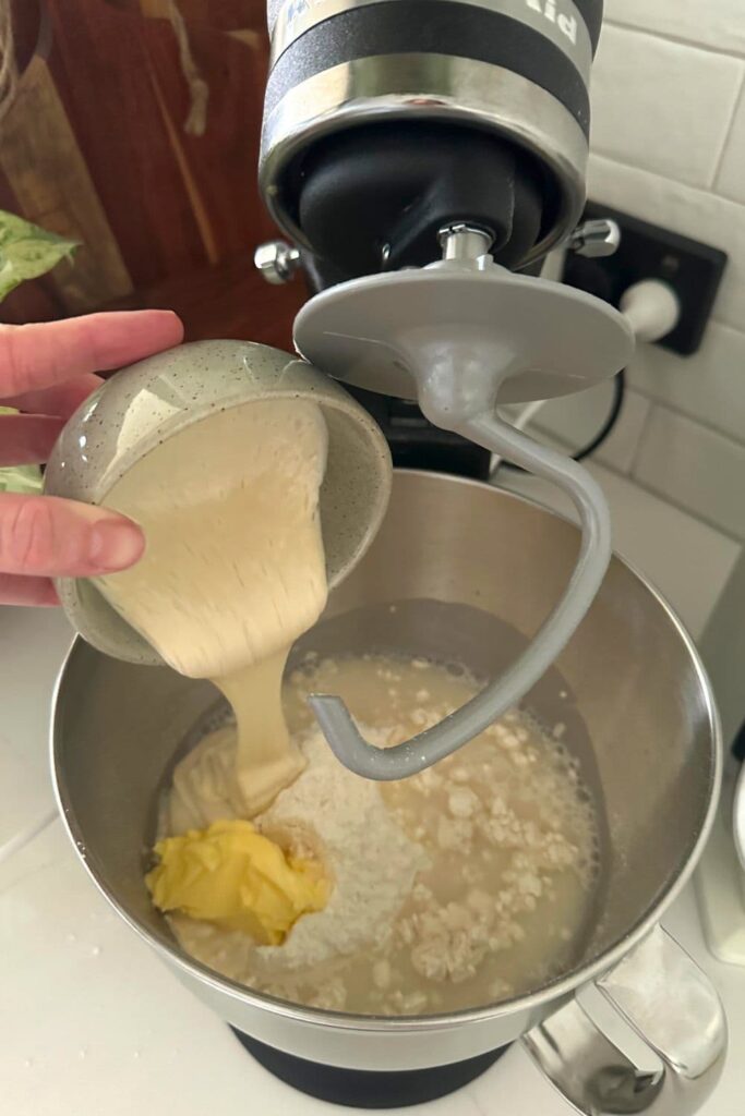 - To a stand mixer bowl (with dough hook attachment) add bread flour, sourdough starter, water, salt and butter. Knead at speed 2 for around 2 minutes or until a shaggy dough has formed. Turn the stand mixer off and allow the dough to stand for around 10 minutes.