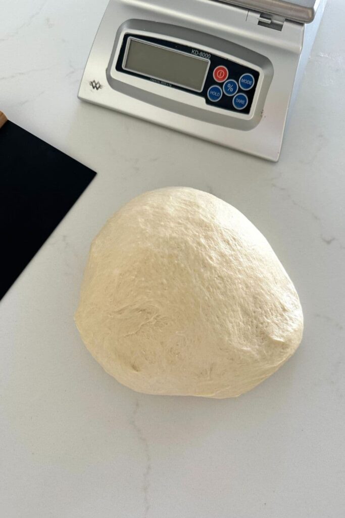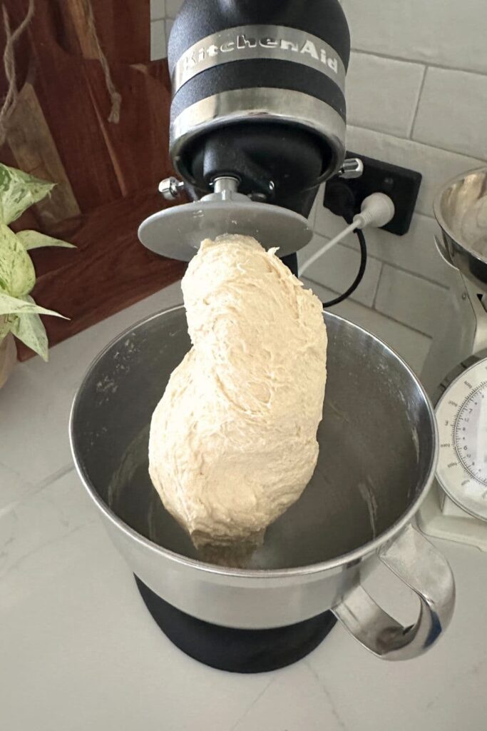 - Once the dough is kneaded sufficiently, turn the mixer off and cover the dough to rise (bulk fermentation). The dough will be elastic and soft, not at all sticky. It should easily come away from the sides of the bowl and the dough hook. You want the dough to rise around 30%.