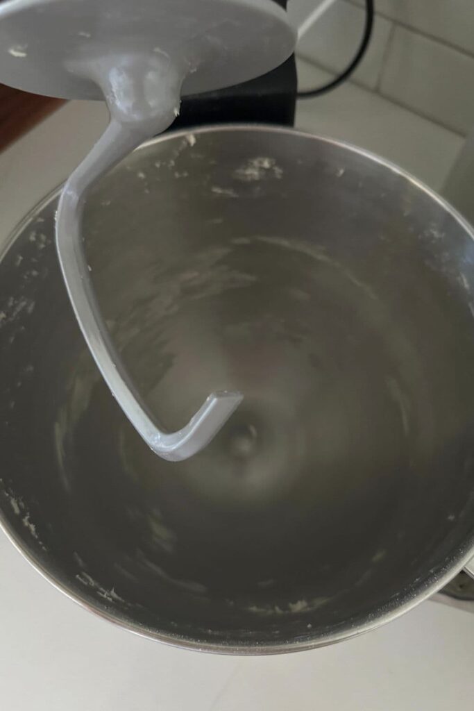 Now, run the stand mixer at speed 1 for around 5 minutes (if you cannot run your mixer continuously, then do this in 1 or 2 minute increments). My mixer handles 5 minutes with ease, however, it really depends on your mixer.