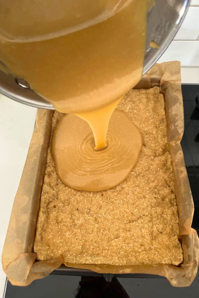 Carefully pour the hot caramel over the base, using a spatula to spread the caramel fairly evenly.