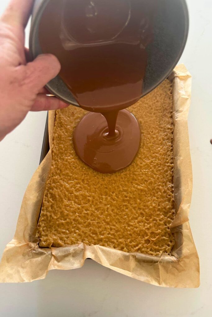 Making sourdough caramel slice has 3 distinct steps. The sourdough shortbread base, the caramel centre and the chocolate topping. Each step is really easy to put together. I often make the base and caramel and then leave it in the refrigerator overnight before topping it with chocolate (usually because I get distracted with other things and forget to go back).