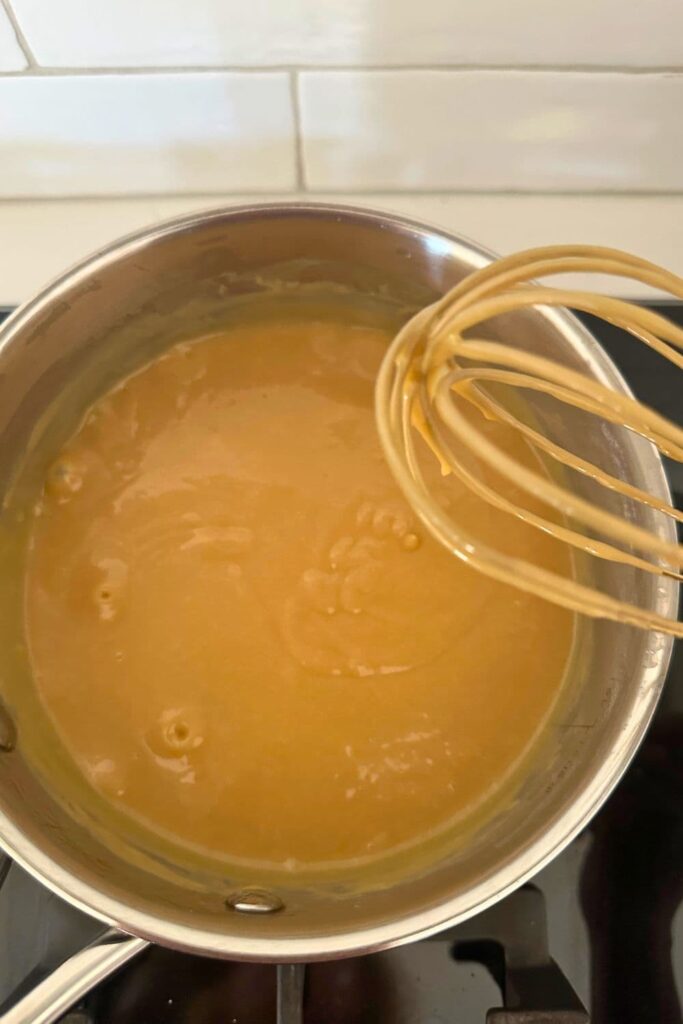 - After 5 minutes of continuous whisking over medium heat, your caramel should be thick and glossy and darker in color. Remove from the heat. This should coincide with the base being baked through.