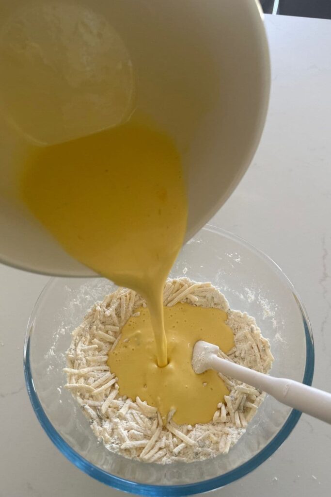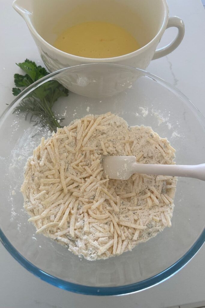 - In a separate bowl mix together shredded cheese, all purpose flour, salt, baking powder, salt and chopped herbs. Make sure that the cheese is completely coated in flour.