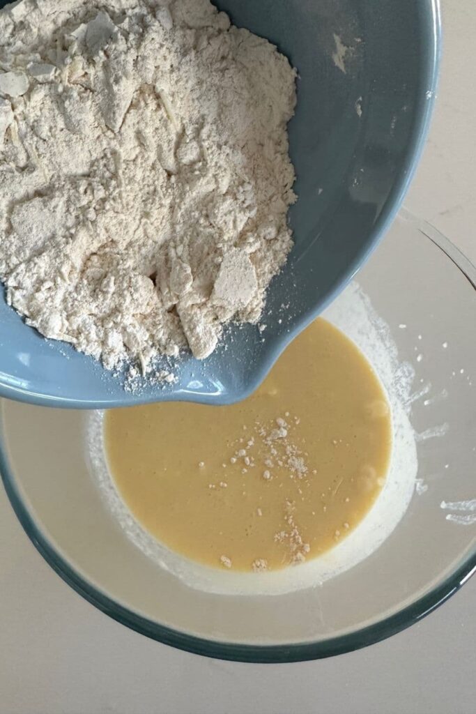 - Now pour the dry ingredients on top of the liquid ingredients.