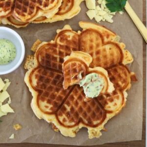 You are going to love just how easy this sourdough cheese waffles recipe is to put together. Many cheese waffle recipes require the egg whites to be whipped into stiff peaks before being folded into the mixture at the very end (a bit like these sourdough blondies that need the egg whites whipped to create that meringue like top). This recipe is so much easier than that!