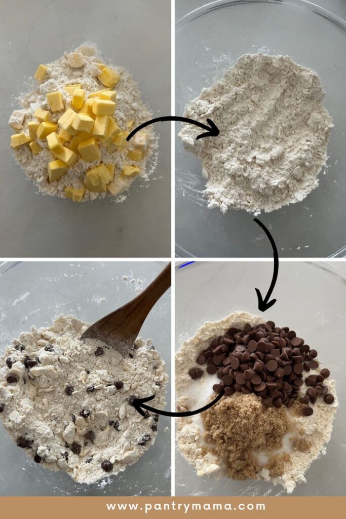 - Once the butter is fully coated in flour, add the baking powder, salt, brown sugar, white sugar and chocolate chips to the bowl with the flour mixture. Gently combine all of the dry ingredients so that they are well mixed through and the chocolate chips are well distributed.