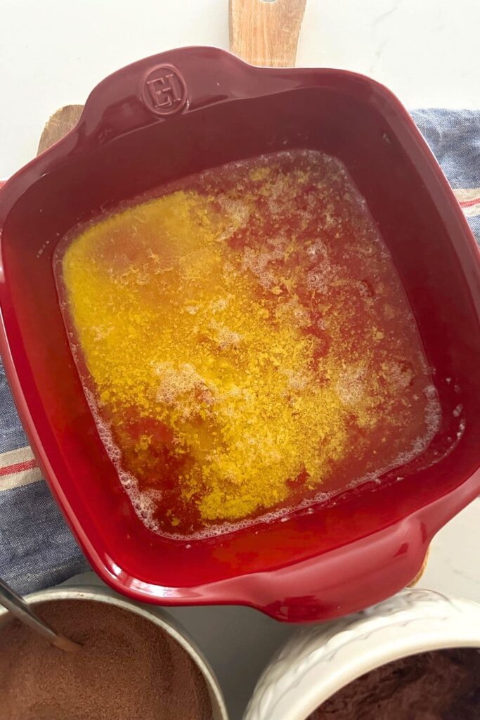 - Now, grab the sugar and cocoa powder mixture you prepared earlier and sprinkle this over the top of the batter in a thick layer. Do not stir it in, let it sit on top of the batter (it's ok if some of it falls down the sides into the pool of melted butter).