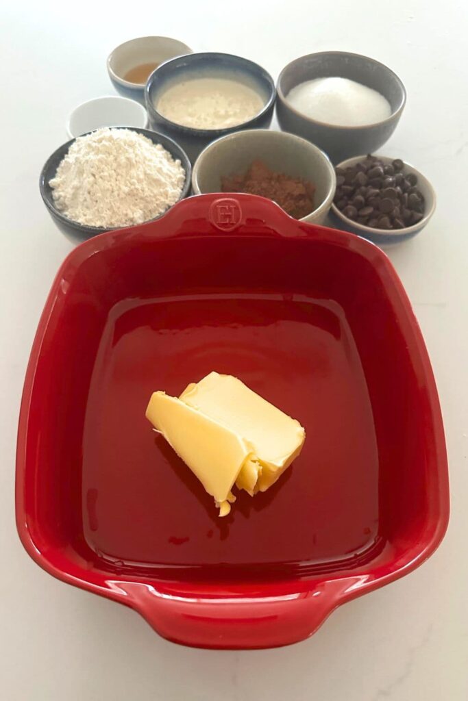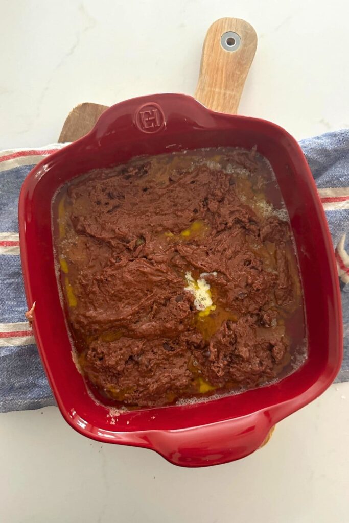 The biggest tip I can give you in terms of the success of this sourdough chocolate pudding is to not stir the butter into the batter! Let it sit on the bottom as this is what brings the sauce together in a rich, fudgy way.