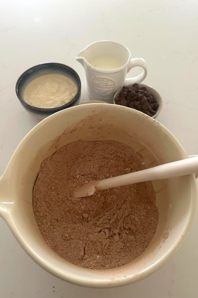 - Then add the sourdough starter, milk and vanilla extract on top and mix until a thick batter forms. Add the chocolate chips and stir them through so that the chocolate chips are well distributed. Set this aside.