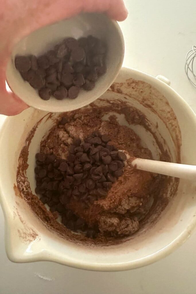 Then add the sourdough starter, milk and vanilla extract on top and mix until a thick batter forms. Add the chocolate chips and stir them through so that the chocolate chips are well distributed. Set this aside.