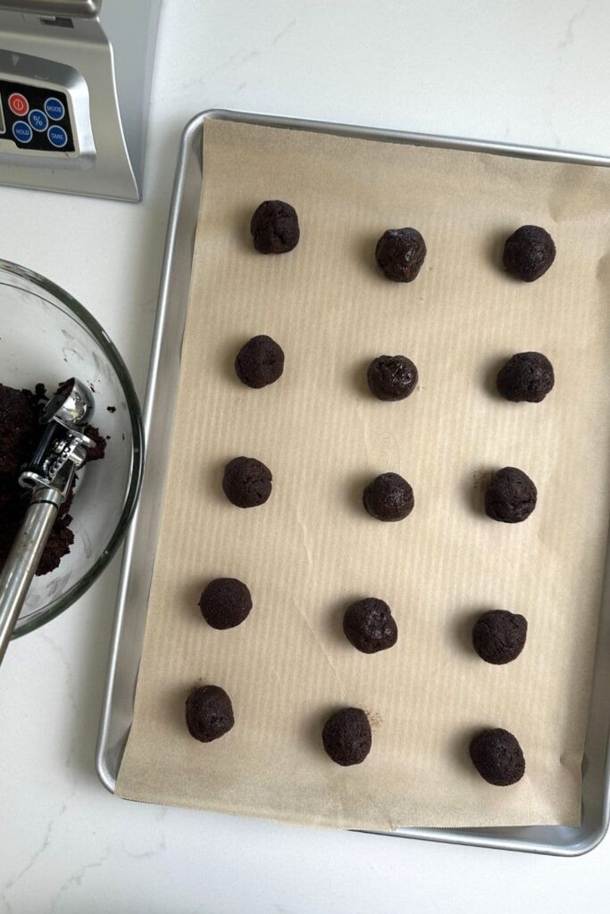 Use a cookie scoop to scoop out balls of dough. I made 24 cookies around 1 tablespoon in size (this equated to 27g of dough per ball).
