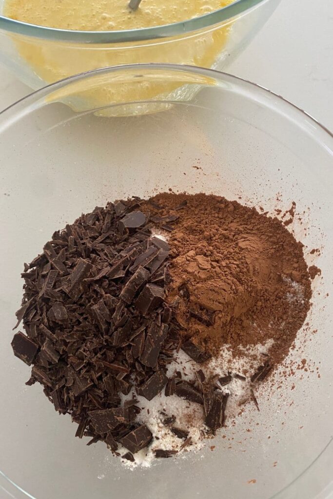 - In a separate bowl, mix together all purpose flour, cocoa powder, chopped chocolate, salt, baking powder and sugar.