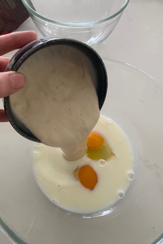 - In a large mixing bowl, mix together sourdough starter, milk and eggs until well combined.