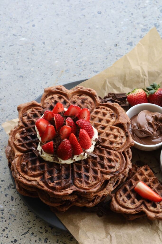 - Make a waffle chocolate cake! Stack the sourdough chocolate waffles together, using raspberry jam and whipped cream or even nutella between each layer. Top with whipped cream, berries and chocolate sauce for the ultimate sourdough chocolate waffle cake!