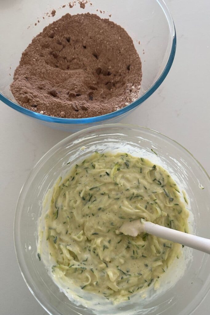 - Now in a separate bowl, mix together all of the wet ingredients (sourdough starter, shredded zucchini, olive oil, egg, Greek yogurt, vanilla extract and milk).