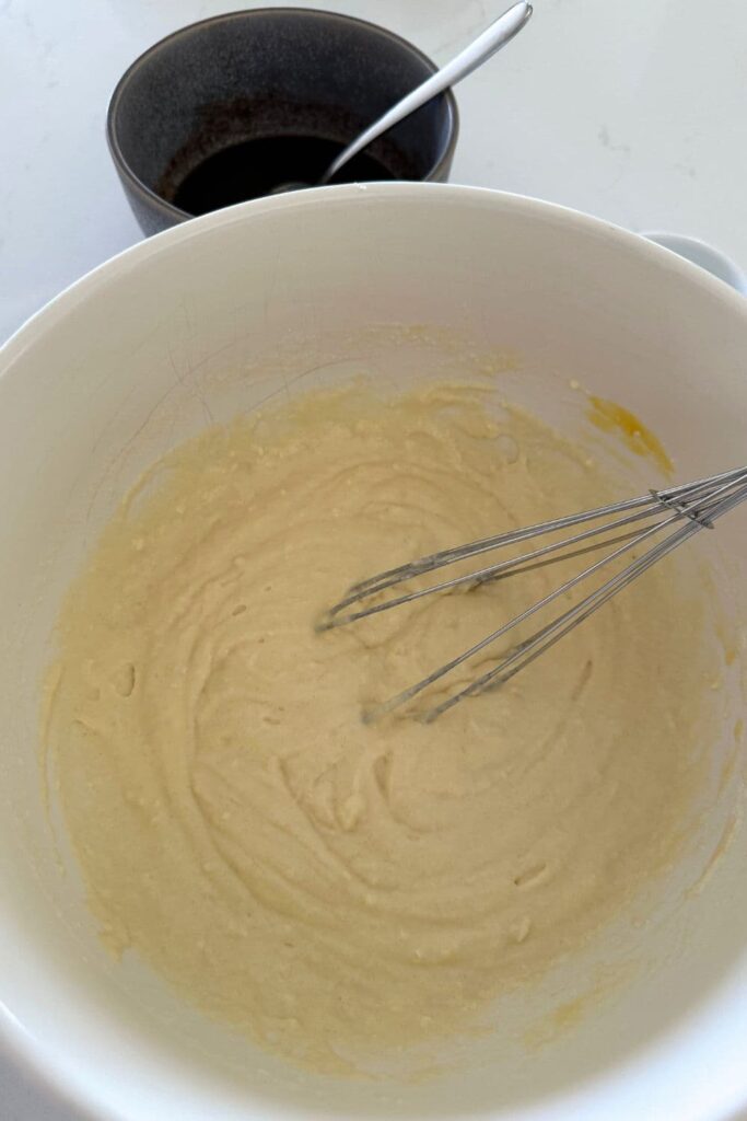 - Add all of the pancake batter ingredients to a large mixing bowl and whisk until well combined. The pancake batter is quite thick as it makes it easier to bake in a sheet pan.