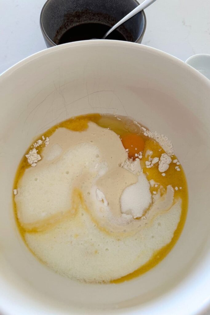 - While the sourdough cinnamon roll pancakes are baking, mix together the icing ingredients until smooth and creamy. Set this aside until the pancake batter is cooked.