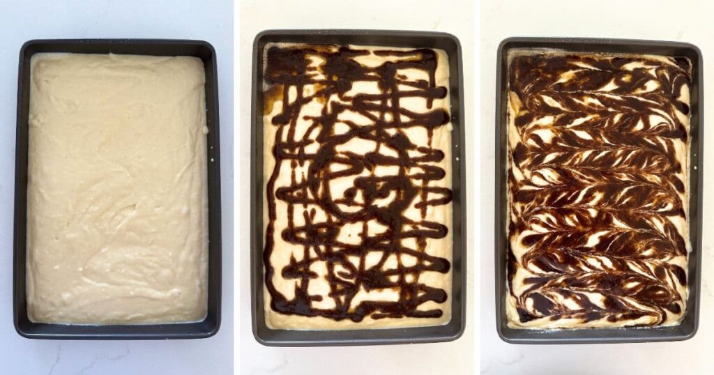- Snip the end of the piping bag filled with brown sugar cinnamon swirl and drizzle the mixture all over the pancake batter. Use a skewer to create a pretty pattern with the brown sugar mixture.