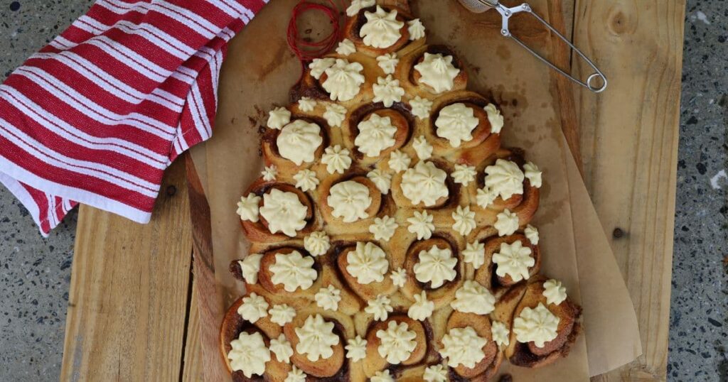 Let's make sourdough cinnamon rolls into a Christmas Tree pull apart, topped with the dreamiest vanilla cream cheese frosting! This gorgeous recipe makes the perfect centrepiece at your Christmas gathering or an easy pull apart dessert for a festive pot luck.
