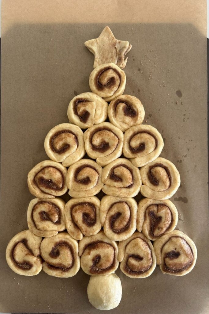 Take a cookie sheet that has been lined with parchment paper and arrange the sourdough cinnamon rolls into the shape of a Christmas tree.