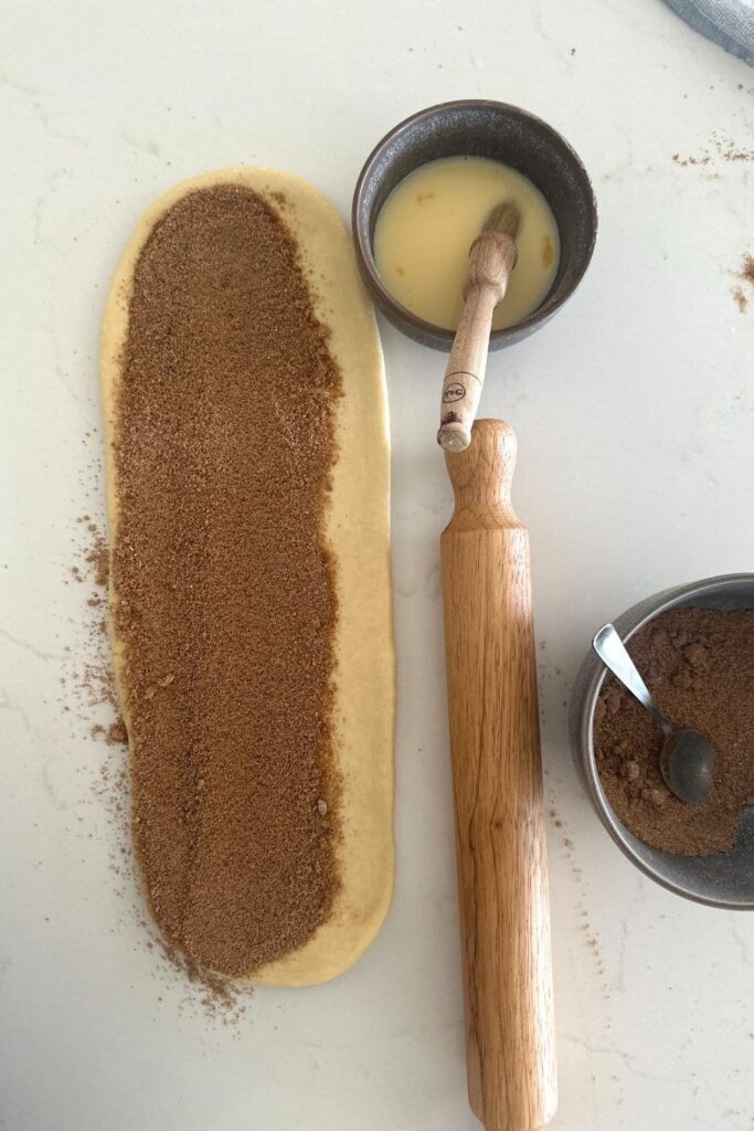 - Once the dough has finished bulk ferment, you will need to fill and shape the cinnamon rolls.