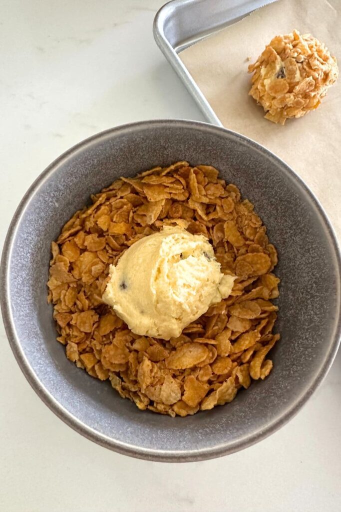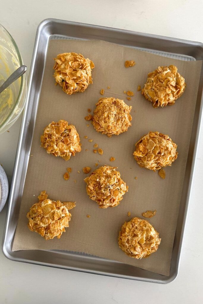 Use a cookie scoop to make 8 equal balls of cookie dough. Roll each ball into the cornflakes and then place onto the pre prepared baking tray.