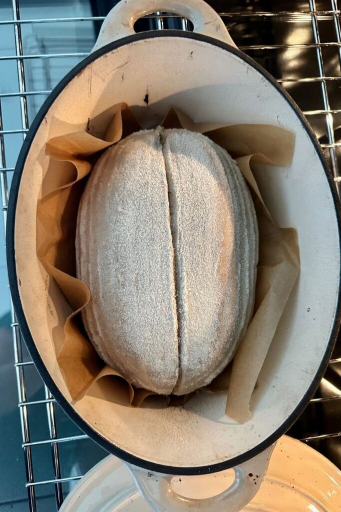 Carefully take your dutch oven out of the oven. Place the sourdough into the preheated Dutch Oven using the silicone sling or parchment paper as a handle.
