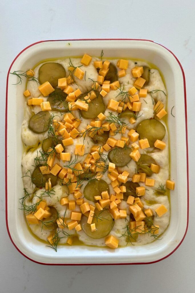 - Topping:Once the dough has filled the tray and is looking puffy and full of volume, you need to dimple the dough and add the toppings.Pour olive oil and a little pickle juice over the top of the dough and then push your finger tips into the dough to create dimples. You might see some bubbles as you do this.Now layer over the dill pickles, dill weed and sharp cheddar cheese and use your finger tips to push these into the dough. You can make them as incorporated as you want to (I like mine mushed into the dough a bit). Garnish with salt if you would like, or leave out if you wish.Leave the sourdough focaccia for around 30 minutes for the toppings to marinate a little and the dough to proof around them while you preheat the oven.