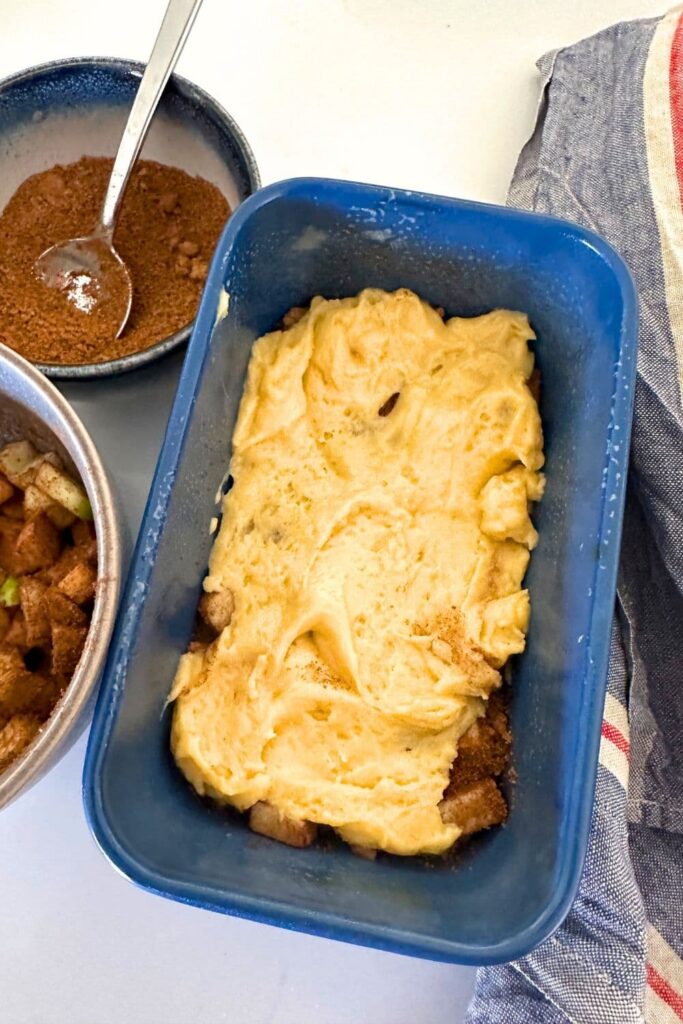- Now add the rest of the cake batter on top, followed by the rest of the apple mixture and cinnamon sugar mixture.