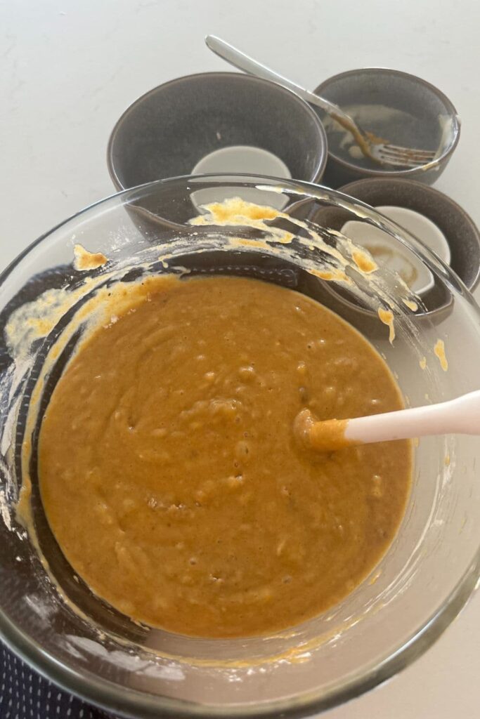 - Add pumpkin puree, egg, sunflower oil, sourdough starter and vanilla together in a bowl. Use a fork to whip these ingredients together to form a light batter.