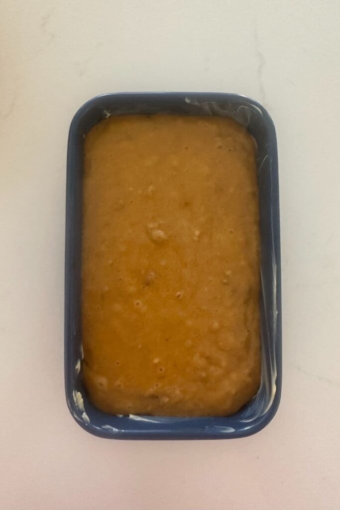- Pour mixture into the prepared loaf pan. The batter for this sourdough pumpkin discard bread is quite runny, but don't worry, it will bake up just fine.