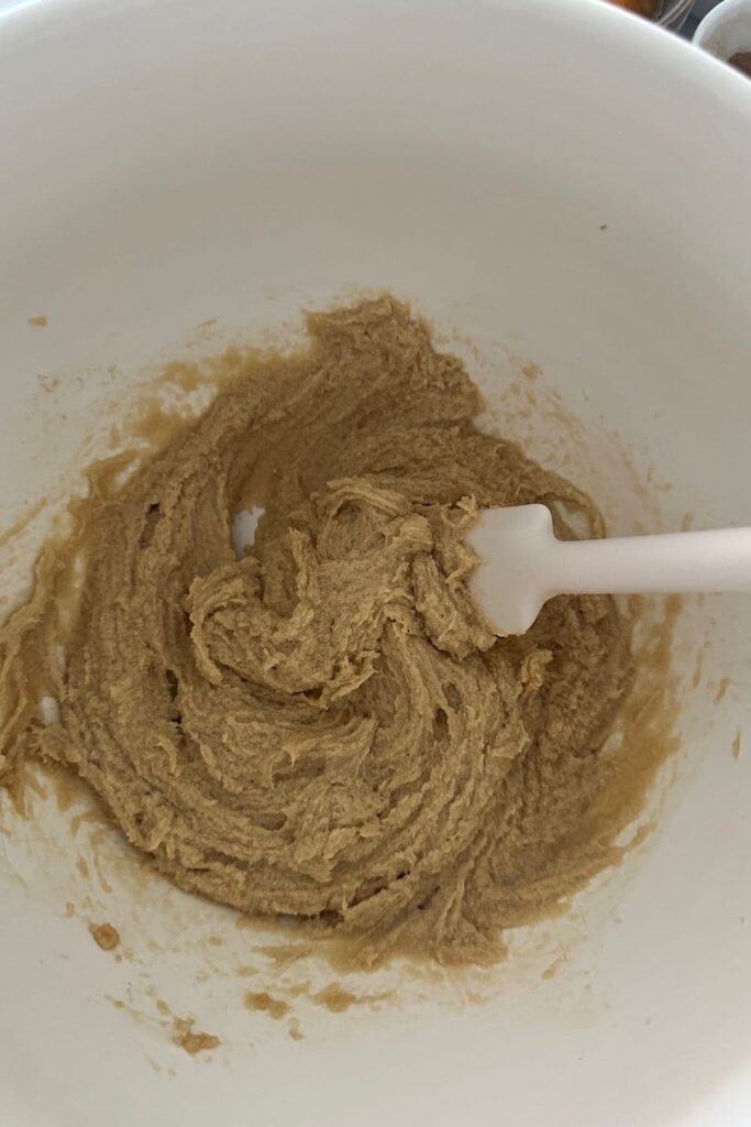 - In a large bowl, cream together butter, white and brown sugars and egg. I have just done this using a fork however you can use an electric mixer or stand mixer if you prefer. I've tried to keep it super simple and create as little washing up as possible for these cookies! It also makes a kid friendly recipe too!