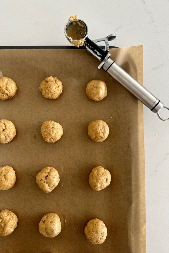 - Using a cookie scoop, form balls of dough (I've made mine 25g) and place onto the cookie sheet around 2" apart. These cookies don't spread too much, particularly because the dough is cold.