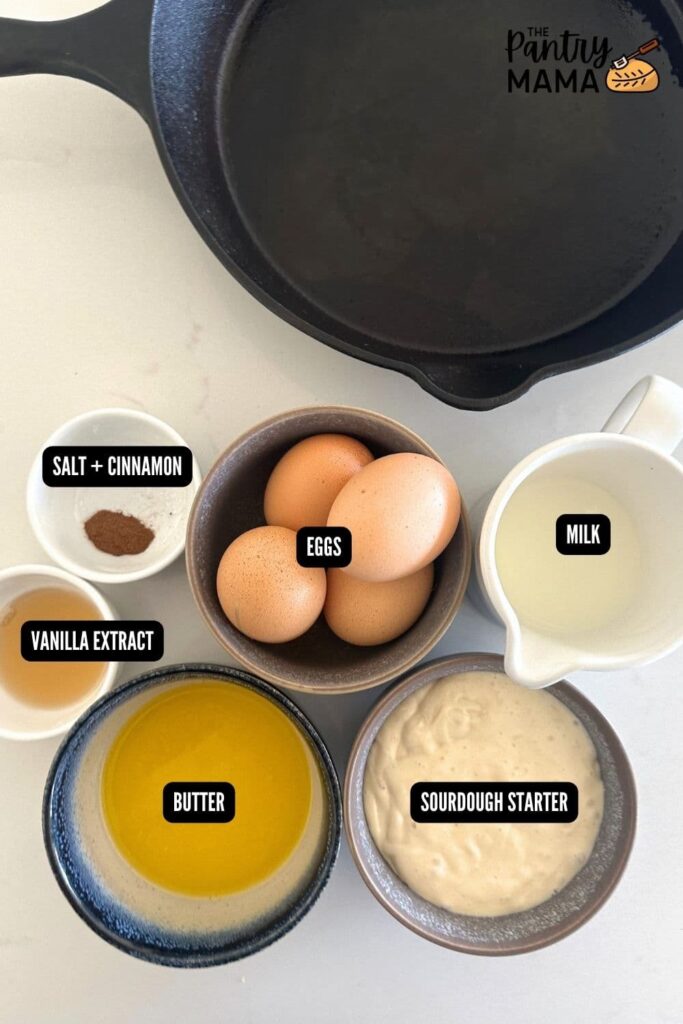 In a large mixing bowl add the sourdough starter, half the butter (reserve the other half for your skillet), milk, eggs, salt, vanilla extract and cinnamon and whisk until it forms a thin batter. It should be thinner than pancake batter (more like a popover batter).