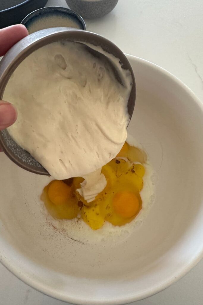 - In a large mixing bowl add the sourdough starter, half the butter, milk, eggs, salt, vanilla extract and cinnamon and whisk until it forms a thin batter. It should be thinner than pancake batter (more like a popover batter).