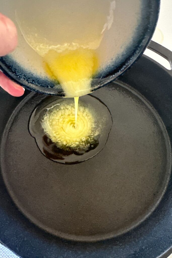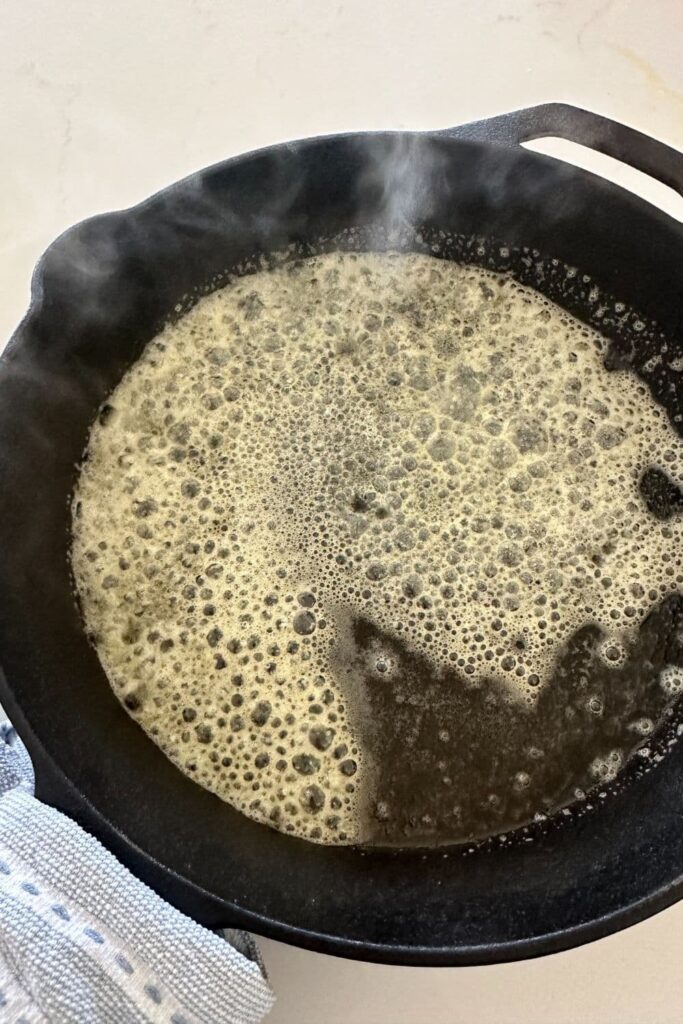 - When the cast iron skillet is ready, carefully remove it from the oven and allow the half of the melted butter that is left to sizzle all around the pan.