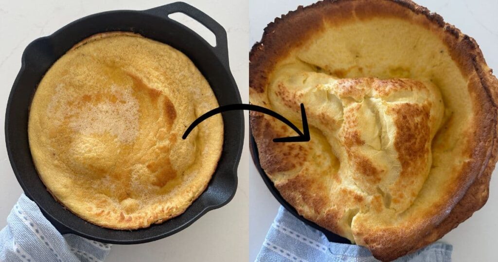 This tasted very good but looked like a piece of cornbread. My granddaughters opened the oven TWICE!!! Could this be why it wasn’t fluffy ? Also the batter sizzled when I poured it in the skillet so I assume it was hot enough but there was alot of butter floating around the edge of the skillet. Any suggestions would be greatly w