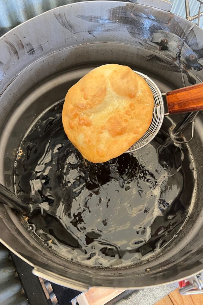 Normally, I fry these sourdough elephant ears in my Dutch Oven filled with 2L of vegetable oil and they work fine. This is an easy way to make these sourdough fry breads inside in your own kitchen.