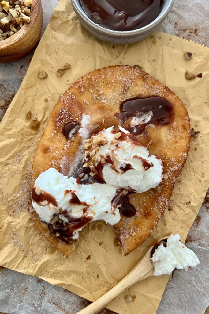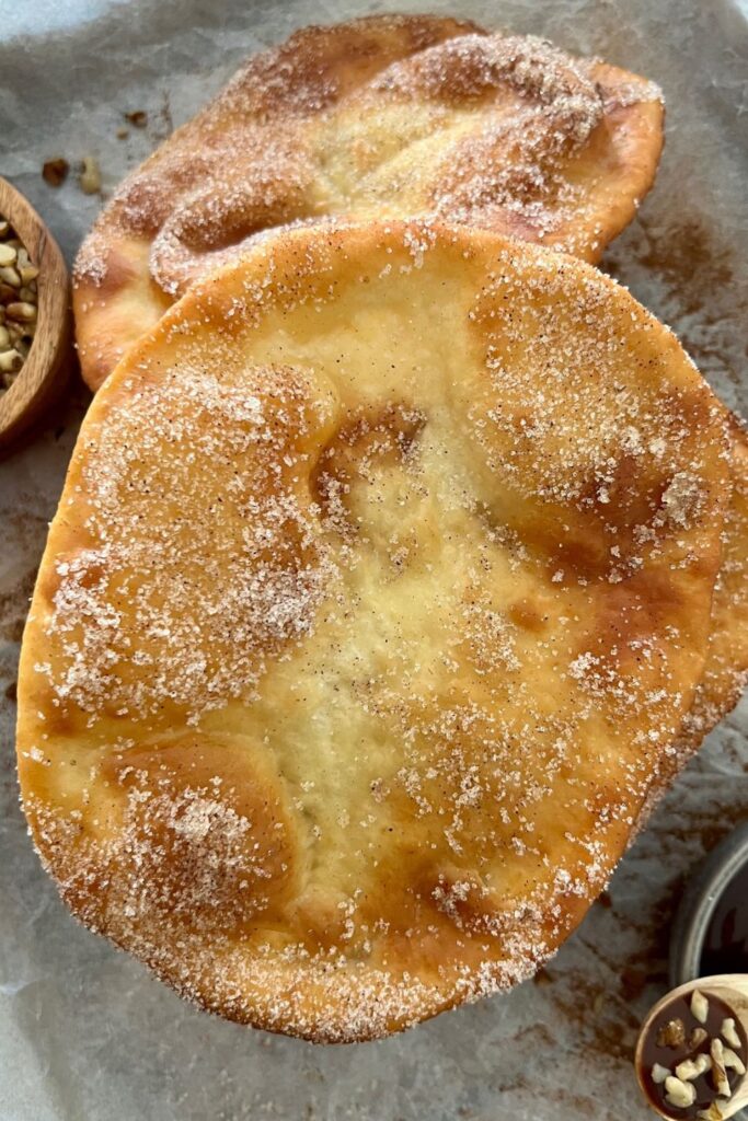 This sourdough fry bread is deep fried in oil and dusted in cinnamon sugar. They can be served with chocolate sauce, nuts, ice cream or whatever you fancy!