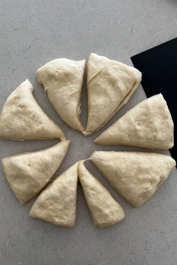 - Once the dough has risen, divide the dough into equal pieces. As these are a rustic type snack, they don't need to be weighed, however if you want to you definitely can.