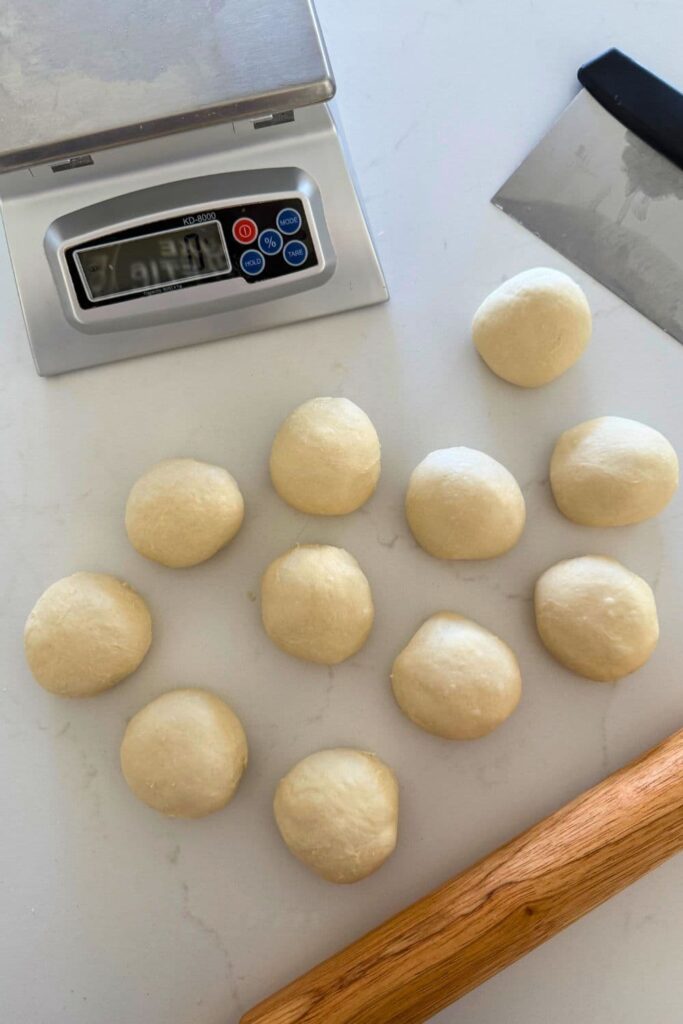 This recipe uses 200g of sourdough starter, which means that your dough will ferment fairly quickly. For more information on how the amount of starter affects fermentation time, go here. Notes on Size of Dough Balls