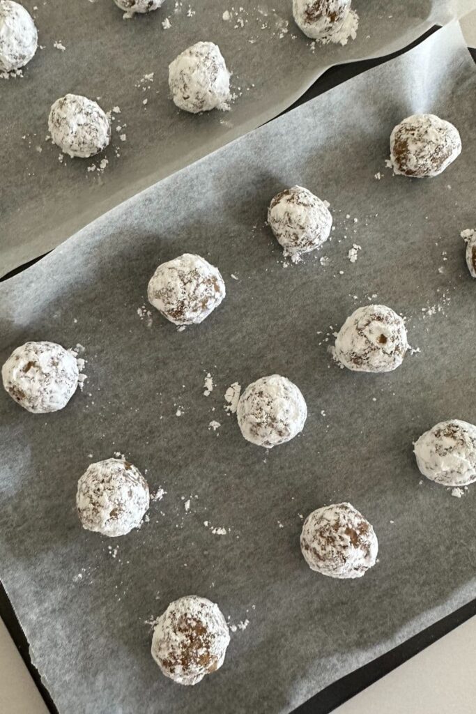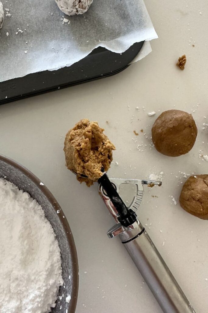 - Using a cookie scoop, scoop large balls of dough and roll them into balls. Roll the balls into the powdered sugar until they are completely coated and then place onto the prepared cookie sheet. You want to leave a space between each one as they do spread out.