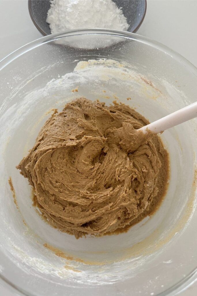 - Now, add the cinnamon, ginger and nutmeg, baking soda and all purpose flour and stir to create a thick cookie dough. The dough will be a bit wetter than a regular cookie dough.